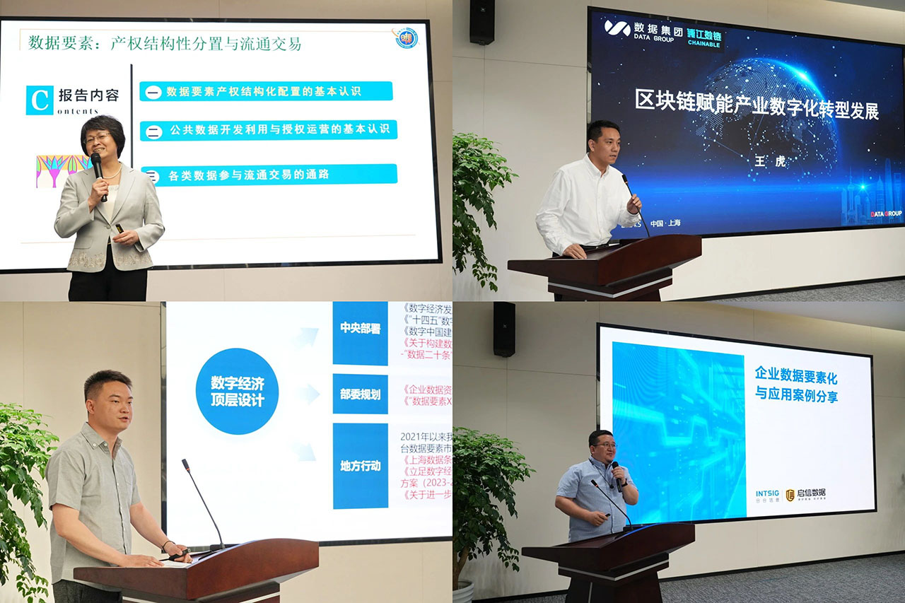 复旦大学管理学院黄丽华教授围绕“数据要素:产权结构性分置与流通交易——基本认识与政策展望”主题对当前国家数据要素相关最新政策和数据业务领域的创新探索实践情况做了全面解读。上海数据集团浦江数链公司负责人和数据资源部专家分别作“区块链赋能产业数字化转型能级提升”和“数据集团数据治理实践分享——以‘天机’平台为例”为主题的交流发言。数字经济商会监事、合合信息的数据业务专家为大家分享了数据资产入表的具体实践案例。