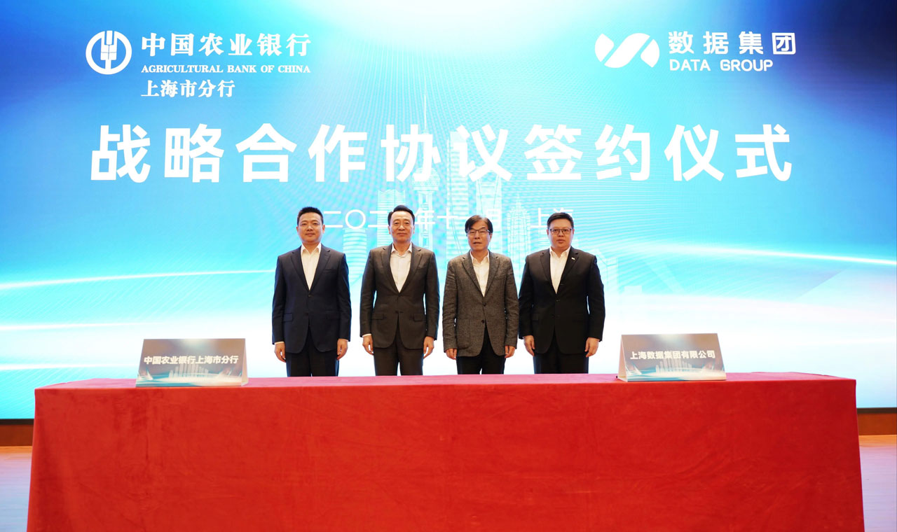 11月21日,数据集团与农业银行上海市分行举行战略合作协议签约仪式。数据集团党委书记、董事长吴建雄,副总裁李小山,农业银行上海市分行党委书记、行长韩国强,党委委员、副行长翟冀,党委委员、副行长朱卫峰等出席签约仪式。
