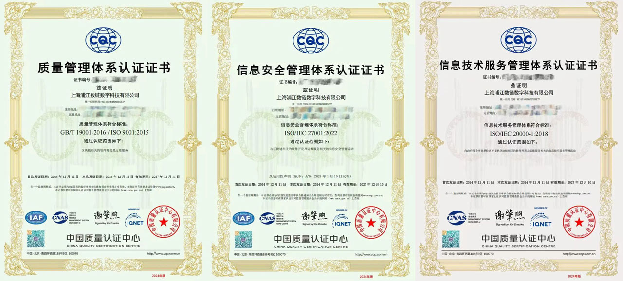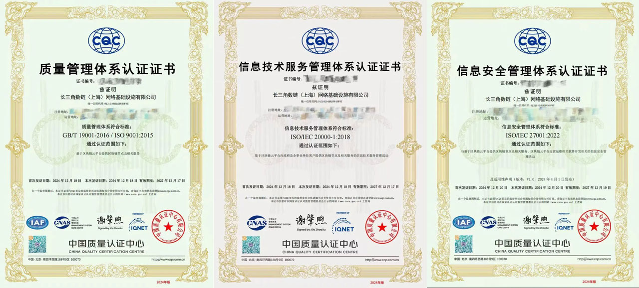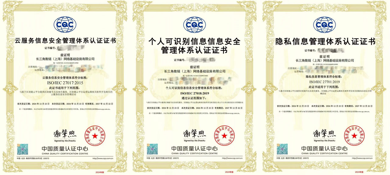 长三角数链公司通过ISO9001质量管理体系、ISO20000信息技术服务管理体系、ISO27001信息安全管理体系、ISO27018公有云个人信息身份管理体系、ISO27701隐私信息管理体系及ISO27017云服务信息安全管理体系六项国际权威认证,认证范围包含长三角数链公司基于区块链云平台提供的区块链节点及相关服务相关的质量控制及信息技术服务,以及基于区块链云平台提供的区块链节点及相关服务、区块链云平台运营运维相关软件开发相关的信息安全管理、隐私信息安全管理、云服务信息安全管理和公有云个人可识别信息安全管理。